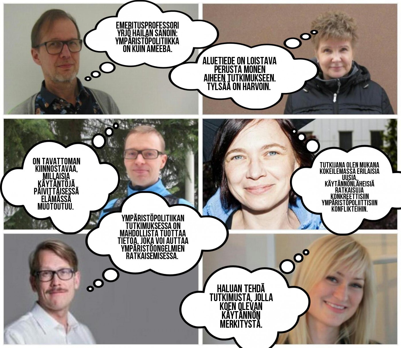 Olen itse tullut Tampereen yliopiston ympäristöpolitiikkaan vuonna 1999, mutta olin väitellyt tohtoriksi jo joitakin vuosia aikaisemmin Turun yliopiston sosiologiassa, jossa olin mukana innostuneessa ja hyvin kollegiaalisessa nuorten ympäristösosiologien tutkimusryhmässä. Kolmeenkymmeneen vuoteen mahtuu sitten tietenkin moninaisia tutkimusaiheita, mutta oman työni syvin olemus löytyy varmastikin ympäristöpolitiikan toimijuudesta, rakenteista ja instituutioista.